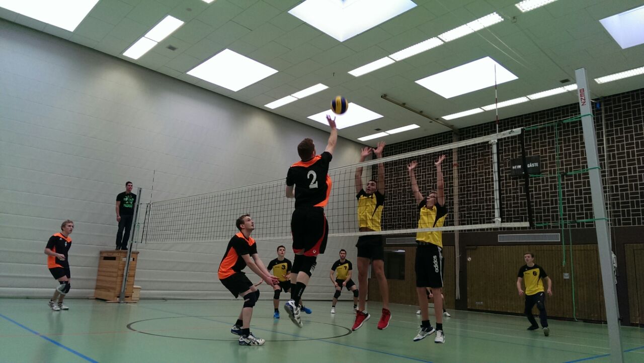 Am Samstag spielten wir im Derby in Hausen gegen deren zweite Mannschaft. Auf dem Großfeld fühlten wir uns am Anfang nicht so recht wohl, spielten etwas verhalten, teilweise auch verkrampft und verloren den ersten Satz mit 20:25. Wir stellten etwas um, wurden sicherer, die Annahme kam und wir spielten schnelle Mittel- und Außenangriffe und in 15 Minuten war der zweite Satz mit 25:16 bei uns. Im dritten Satz ging es so weiter und wir führten schon sicher mit 16:8 und 18:12. Dann kam eine uns leider schon bekannte kurz-zeitige Annahmeschwäche und der Gegner führte auf einmal mit 21:20. Matze kam rein, machte drei Punk-te in Folge, aber wir verloren leider mit 25:23. Trotzdem ließen wir natürlich die Köpfe nicht hängen und spielten druckvoll weiter und gewannen die Sätze 4 mit 25:17 und 5 ganz deutlich mit 15:4. Mit diesem Sieg haben wir uns an die Tabellenspitze herangetastet und den dritten Tabellenplatz gesichert. Es spielten Re-ne, Timm, Maxi, Philip, Matze, Felix und Didi.
